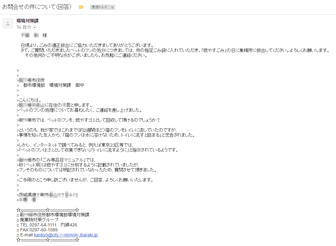 猫のフンはトイレに流せない!?【追記有】 日記 2016年06月28日 先日、我が家ではミラのうんちもトイレで流してるよ~と書きましたが、 友人から、衝撃的な情報を頂きました。 「ミラちゃんのことだけど…… 猫のフンって、水に溶けなくて、トイレに流すと詰まるらしいよ。」 !?!? ( ゚Д゚ ) !?!? 慌てて調べました…… いろんなページで見られますので、ここでは詳しく書きませんが、 結論からして、トイレに流すのは、ダメそうです!! 友人の言う通り、溶けにくいみたいですね。 じゃあ、明日からは、燃えるゴミで処理か~ (>_<) と思いきや……ところがどっこい!! 東京23区では、トイレに流すように指示されているとのこと!! 地域によって対応が違うようです。 早速、うちの市はどうなのか、調べてみました。 ”砂(ペット用)”は、燃えるゴミでOKと書いてある。 ということは、うんちも一緒に捨てて大丈夫かな? とは思うのですが、 わたし、極度の心配性なので、市役所にメールしちゃいました。(^_^;) 返信が来たら、また更新いたします! 12時追記 市役所から返信を頂きました! 日頃より,ごみの適正排出にご協力いただきましてありがとうございます。 さて,ご質問いただきましたペットのフンの処分につきましては、市の指定ごみ袋に入れていただき,「燃やすごみ」の日に集積所に排出してください。よろしくお願いします。 その他何かご不明な点がございましたら,お気軽にご連絡ください。 (本文より一部抜粋) 証拠画像(?)はこちらです。大きいので、クリックしてご覧ください。 個人情報ダダ漏れ部分は、モザイク加工をさせて頂いております。m(_ _)m PR http://skneko.blog.shinobi.jp/diary/20160628猫のフンはトイレに流せない!?【追記有】 いつもご訪問ありがとうございます! お気に召しましたら、このバナーをクリックし、 ランキングに投票して頂けると嬉しいです♪ (クリックした時点で投票は完了します^^)
